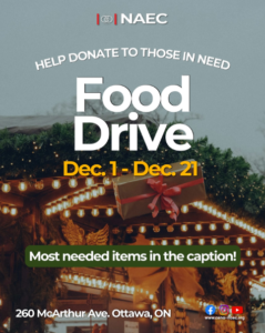 Every Sunday from now until December 21, New Alliance Evangelical Centre (NAEC) at 260 McArthur Ave., Vanier, ON K1L 6P4 will be hosting a Christmas Food Drive during our 9:00 a.m. to 10:30 a.m. service.
