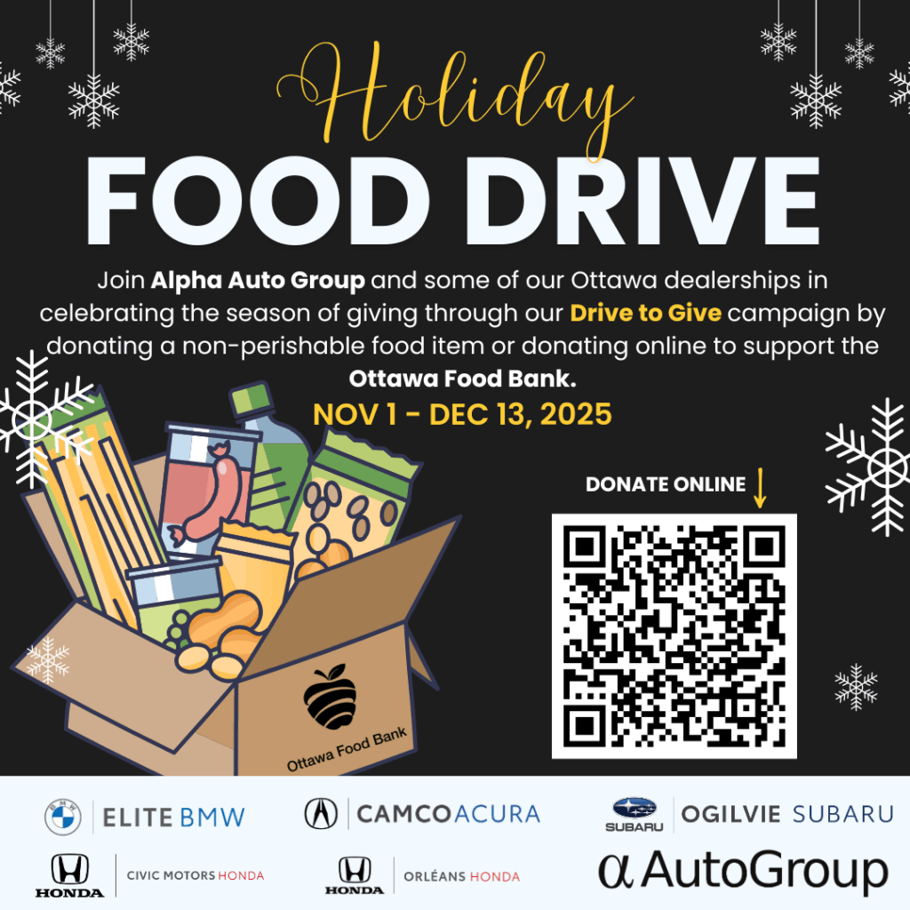 Camco Acura, Elite BMW et Civic Motors Honda recueillent des dons de nourriture et de fonds pour La Banque d’alimentation d’Ottawa tout au long de la saison des Fêtes. Si vous visitez l’une de ces concessions du Groupe automobile Alpha, n’oubliez pas de contribuer à un impact positif dans la communauté en faisant un don.