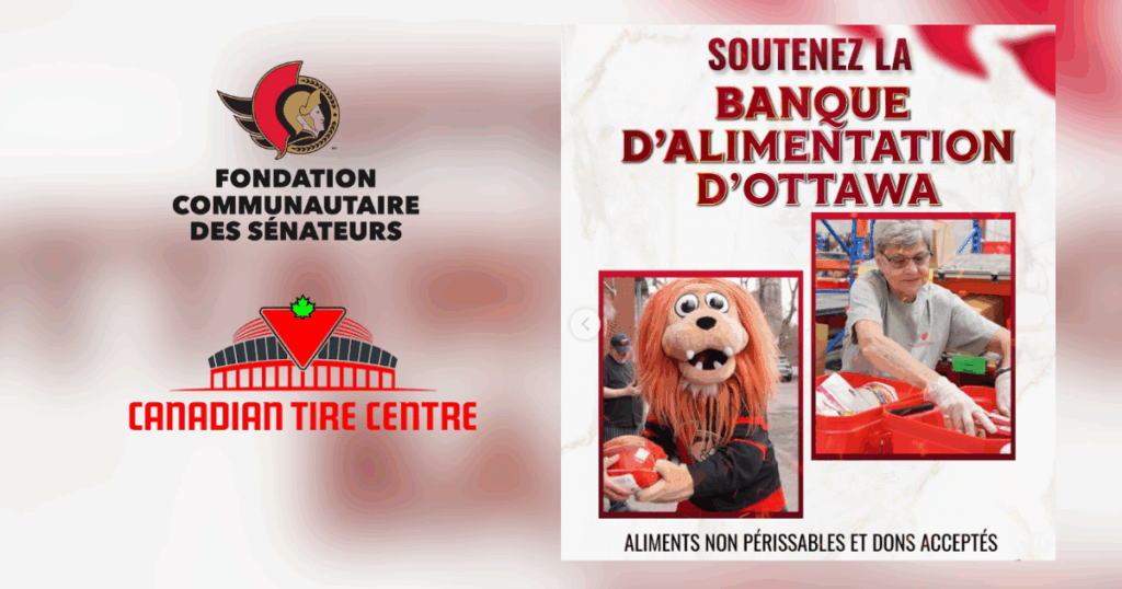 C’est un autre jour de match à domicile pour les Sénateurs d’Ottawa le lundi 13 octobre ! Le coup d’envoi est prévu à 13 h, alors qu’Ottawa affrontera les Predators de Nashville lors d’une matinée de Thanksgiving. La Banque d’alimentation d’Ottawa sera sur place pour accepter les dons qui serviront à fournir aux familles la nourriture dont elles ont besoin pour célébrer Thanksgiving. Les fans présents sont encouragés à apporter des denrées alimentaires non périssables et non utilisées au match afin de les donner.