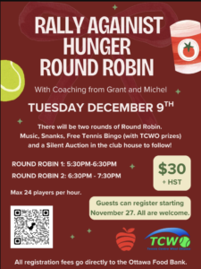 All are welcome as Tennis Centre West Ottawa (TCWO) hosts a Rally Against Hunger fundraising event on December 9, 2025, from 5:30–9:00 pm....