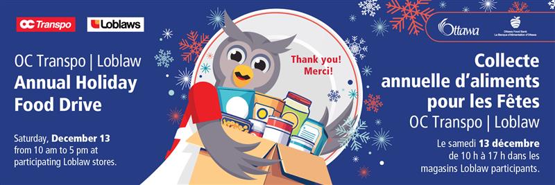 December 13th – OC Transpo is holding its 41st OC Transpo/Loblaw Annual Holiday Food Drive. Drop off your non-perishable food donations from 10 am to 5 pm at participating Loblaws, Real Canadian Superstore, Your Independent Grocer and No Frills stores across
